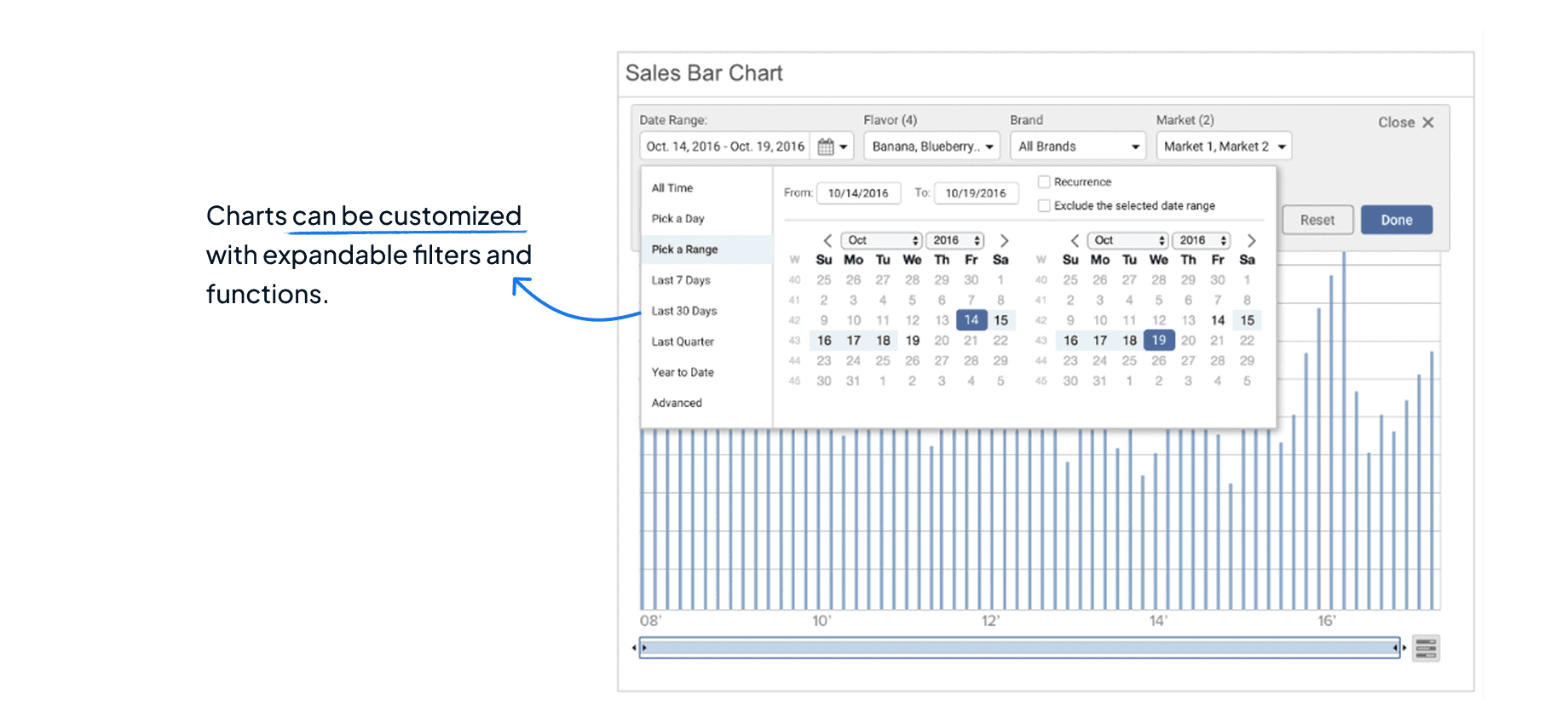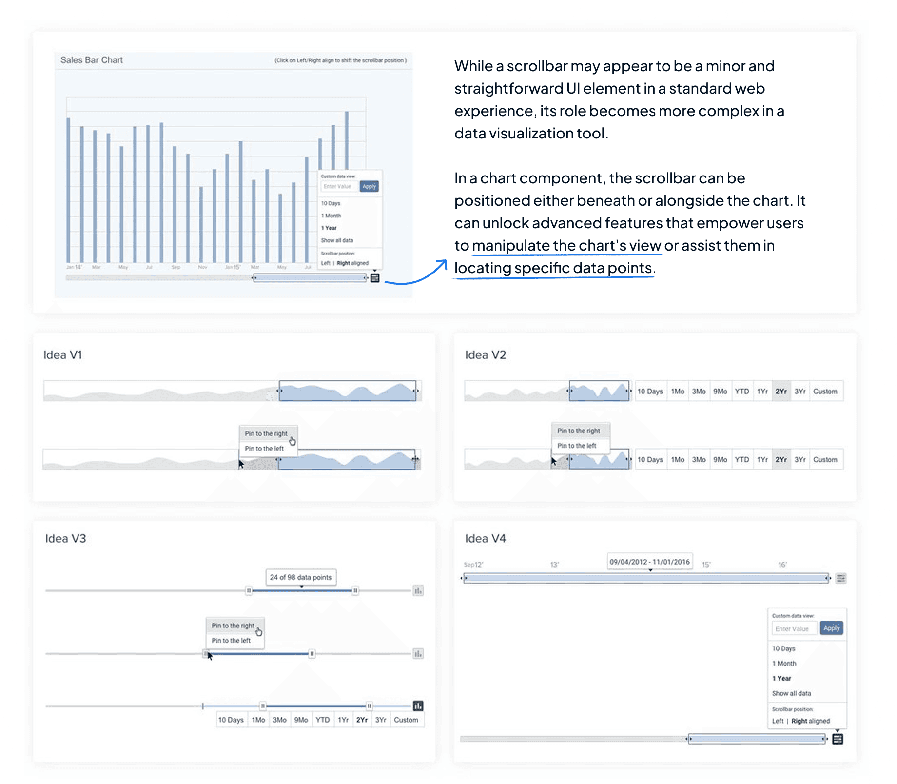 In the beginning of iCharts product redesign, I started with tactical tasks while learning more about the product itself. Scrollbar is one of the UI elements I worked on. It includes advanced functionalities for customers to change a chart’s view. I did some research on the design patterns and came up with a few ideas to be discussed with PMs and engineers.