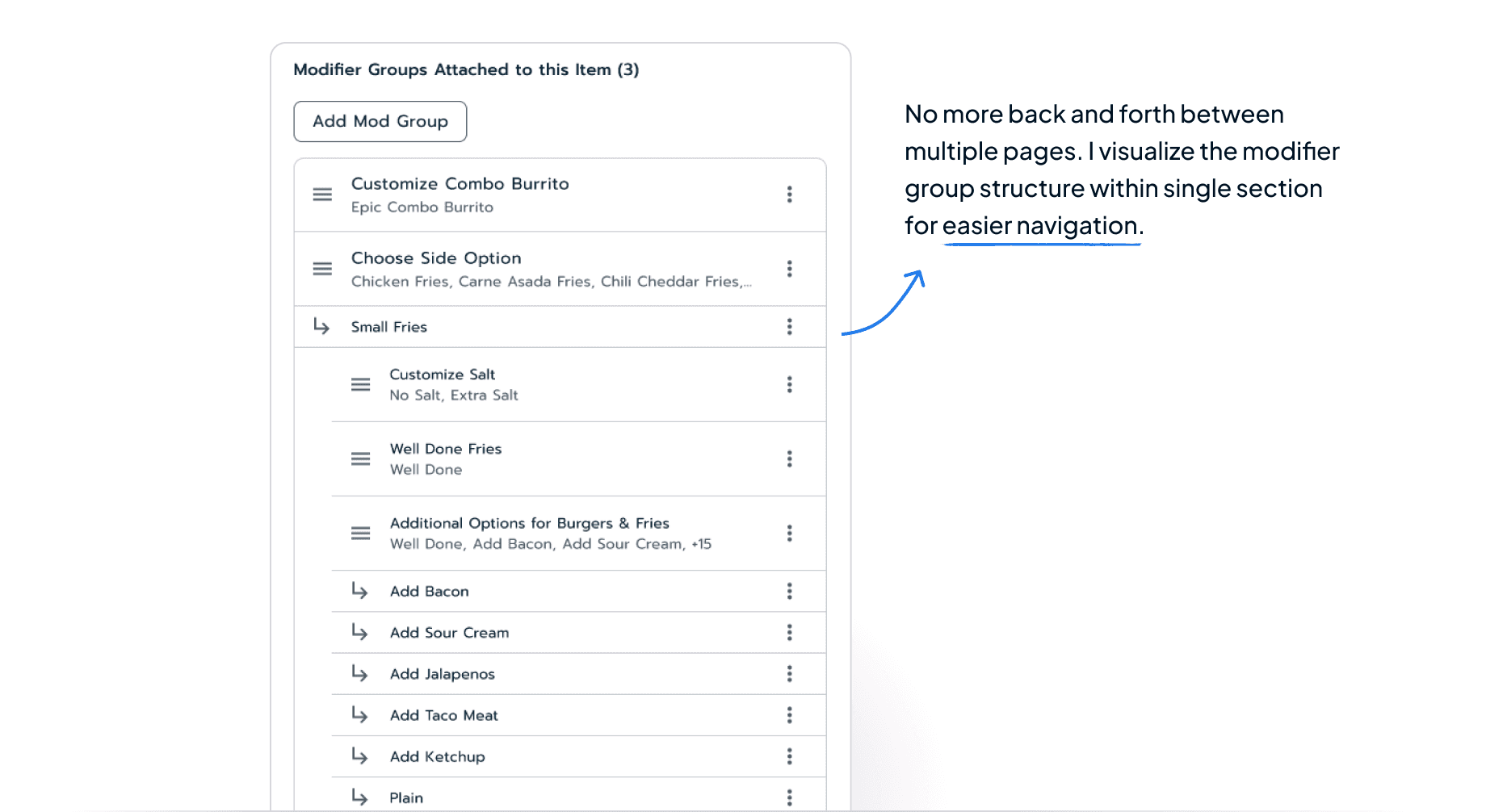 Looking ahead, I designed the foundation for a unified menu system that enables brand and franchise-level editing—a critical capability as Presto scales from dozens to hundreds of restaurant locations. This strategic thinking demonstrates how tactical design decisions support long-term business growth.Positioned platform for franchise-level management capabilities