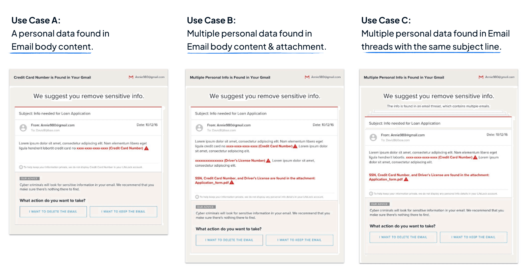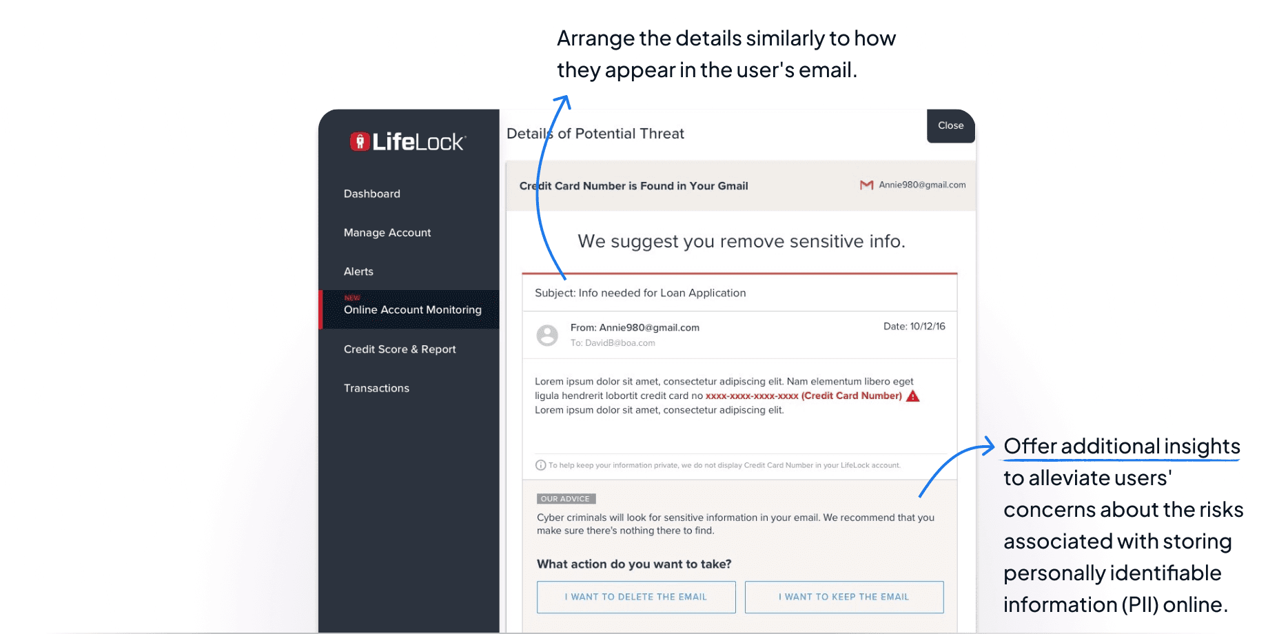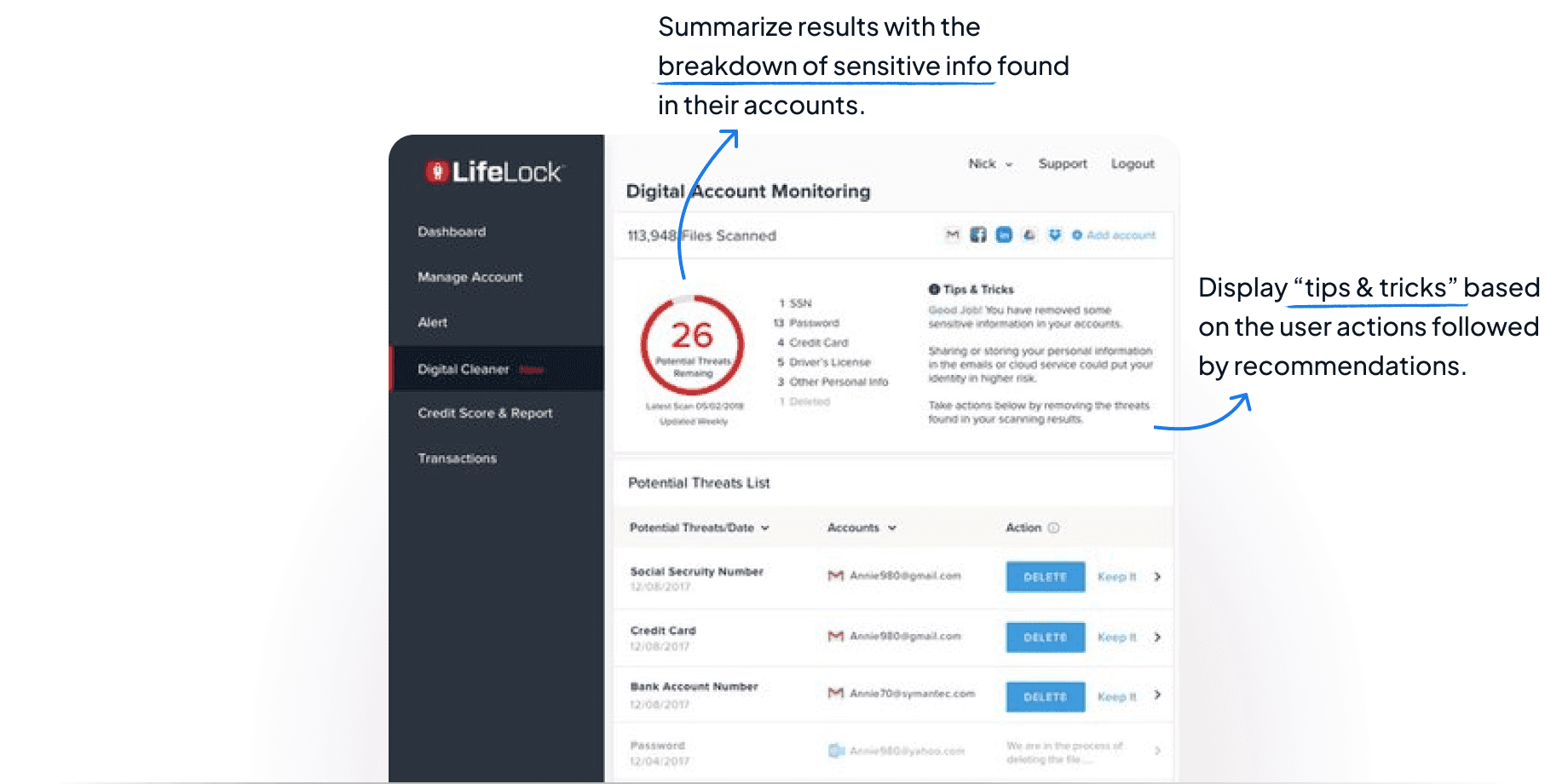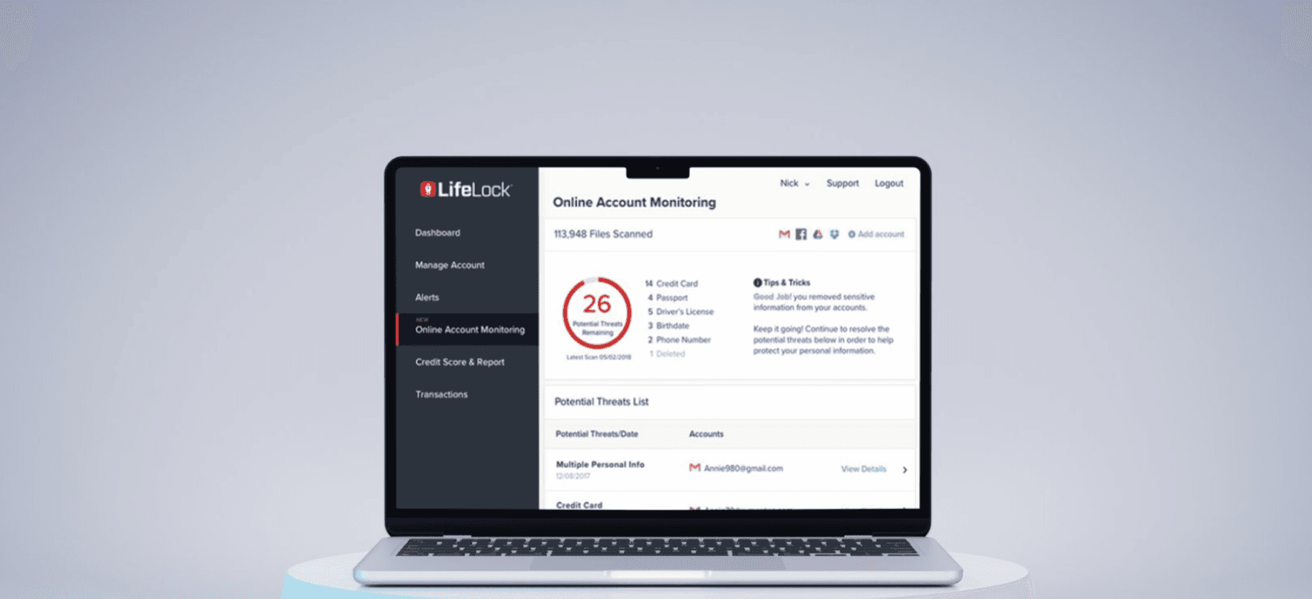 Online Account Monitoring is an additional LifeLock feature offering customers identity protection for their online accounts, including email, cloud storage, and social accounts (e.g., Gmail, Dropbox, Facebook). Users will get alerted if sensitive information (SSN, bank accounts, passwords, etc.) has been found in their accounts that could expose their identities in the event of a breach.